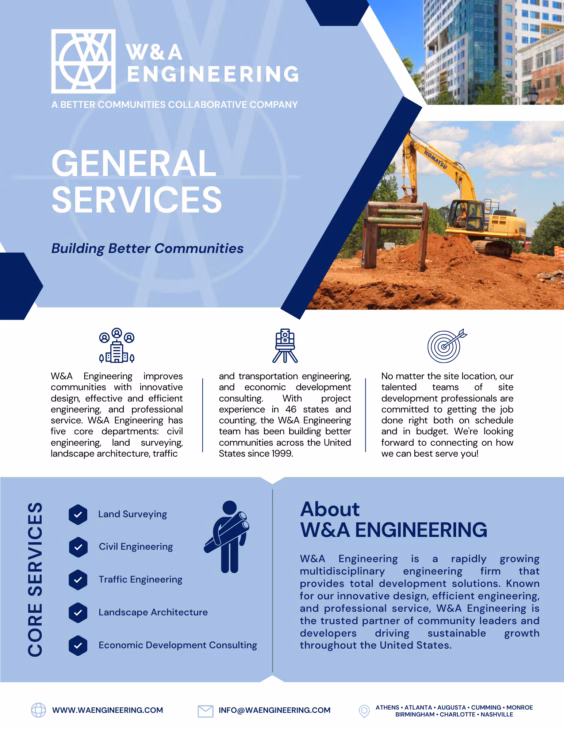 Welcome to our resource library! W&A Engineering is dedicated to building better communities throughout the Southeast with innovative design and total development solutions. Our multidiscipline team of skilled and licensed professionals, whose project portfolio spans 46 states, have collaborated to share their insight and expertise!